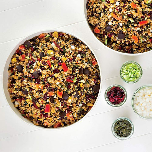 Cranberries, papaya, καρύδα, κολοκυθόσπορος, bitter σοκολάτα, ανανάς εμποτισμένος σε χυμό cranberry και πράσινο κίτρο.